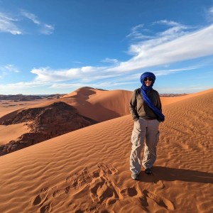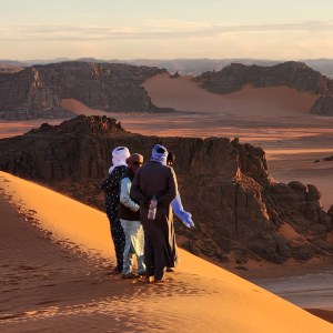 J’ai écrit ce carnet de voyage après une formidable aventure en Algérie début 2024. C’est un hymne au désert, à l’amitié, à la nature et aux hommes bleus, les Touaregs. Des hommes généreux, accueillants et fiers de leur héritage de nomades, avec qui mon mari, nos amis et moi avons passé une semaine inoubliable. J’y exprime mon tanmirt à Bakri et son équipe, tanmirt à la vie, aux paysages pittoresques, à cette pause loin du bruit et de la foule de Manhattan, où je vis. Tanmirt à Amel, Chafika et Ali, sans qui ce voyage n’aurait pas eu lieu.